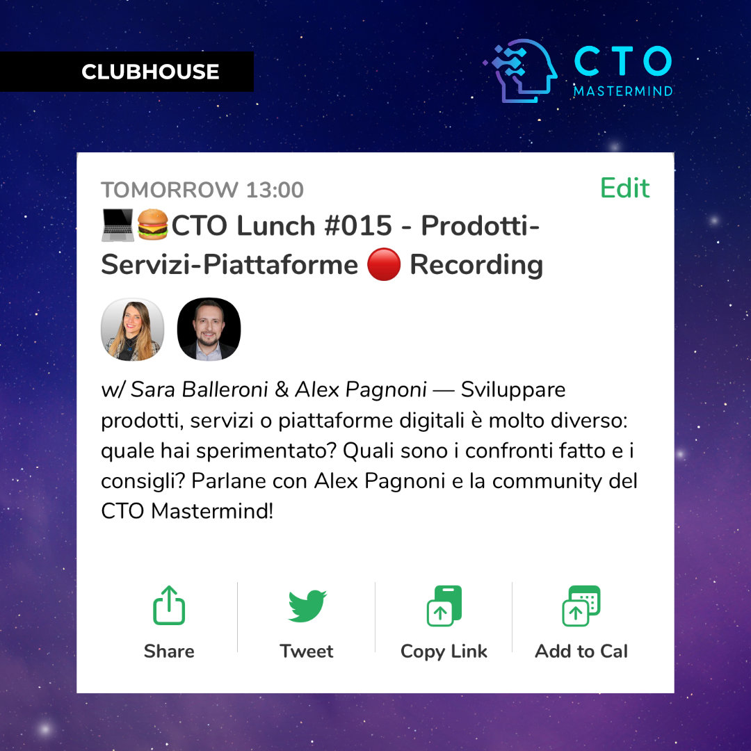 Unisciti a Alex Pagnoni e ai membri del CTO Mastermind su Clubhouse per un pranzo tecnologico in cui confrontare esperienze e opinioni, migliorando continuamente le tue competenze.