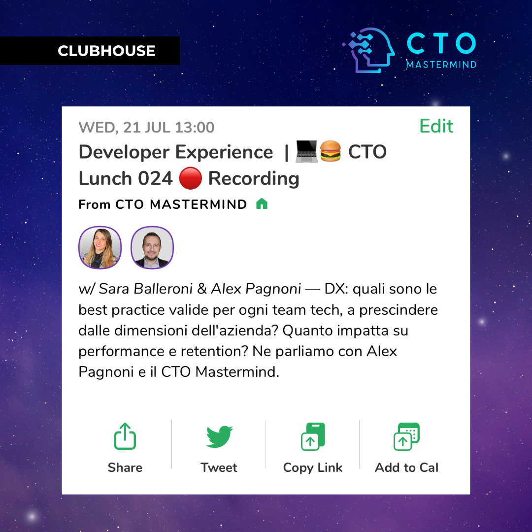 Unisciti a Alex Pagnoni e ai membri del CTO Mastermind su Clubhouse per un pranzo tecnologico in cui confrontare esperienze e opinioni, migliorando continuamente le tue competenze.