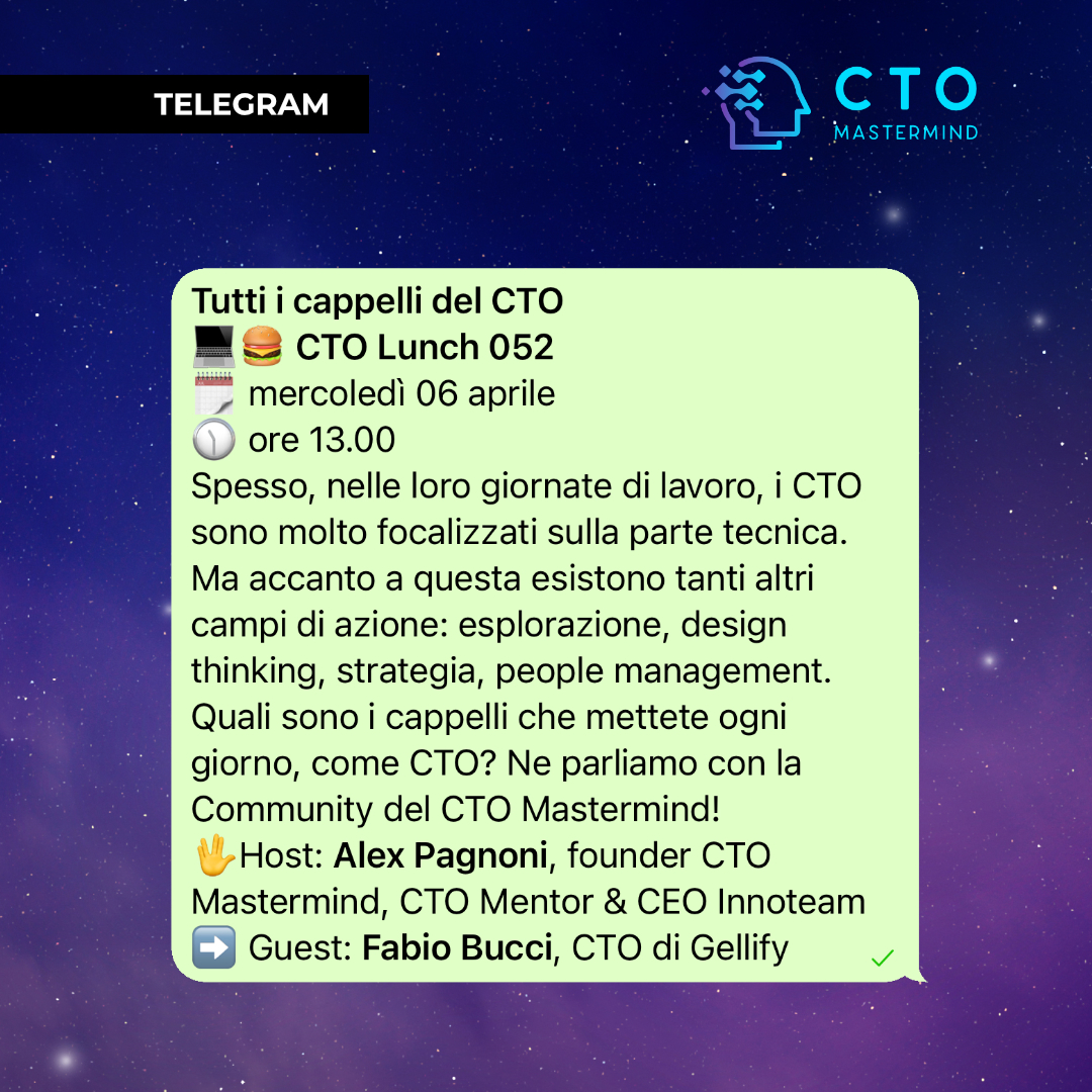 Per partecipare al CTO Lunch entra nel gruppo Telegram di CTO Mastermind.