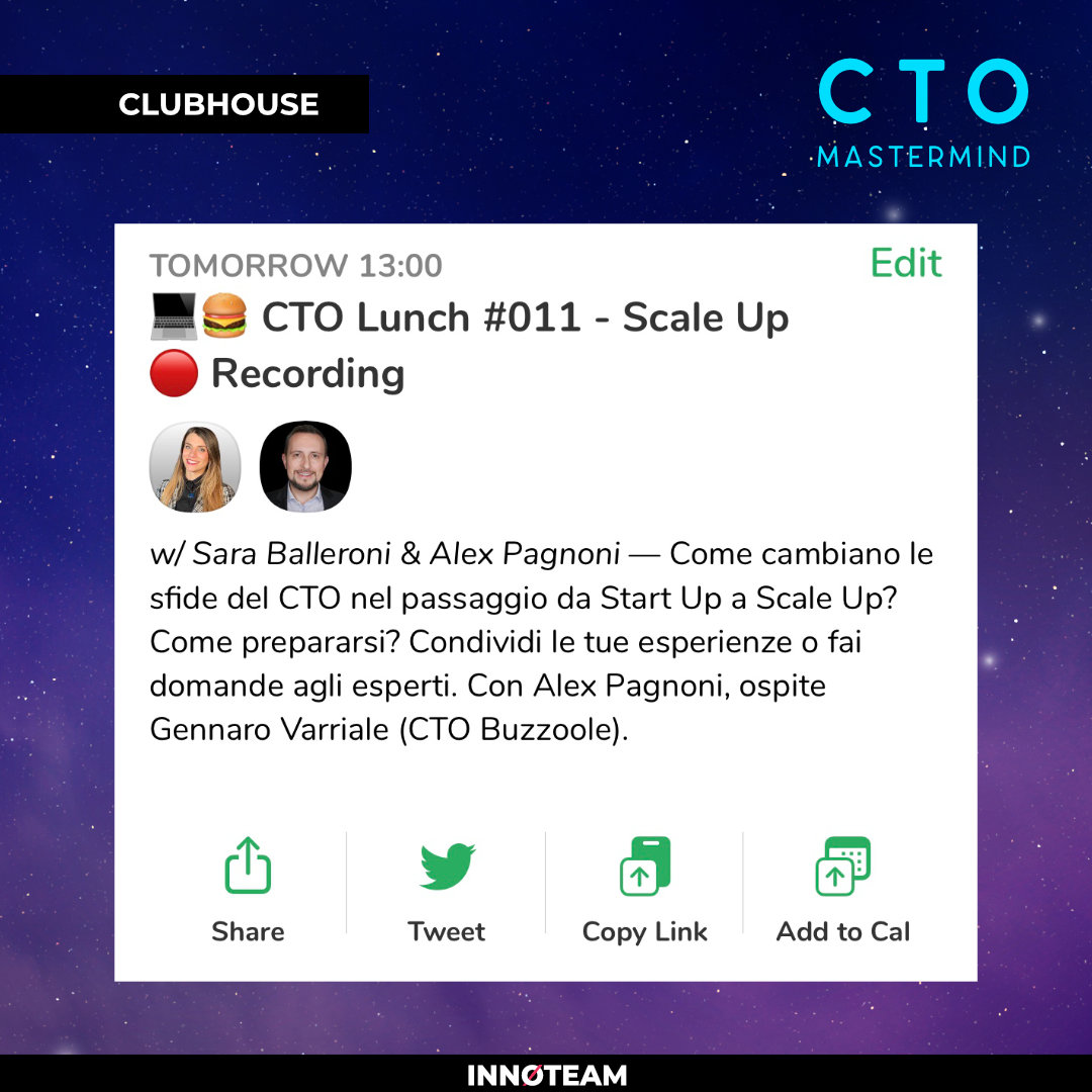 Unisciti a Alex Pagnoni e ai membri del CTO Mastermind su Clubhouse per un pranzo tecnologico in cui confrontare esperienze e opinioni, migliorando continuamente le tue competenze.