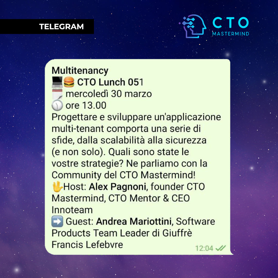 Per partecipare al CTO Lunch entra nel gruppo Telegram di CTO Mastermind.