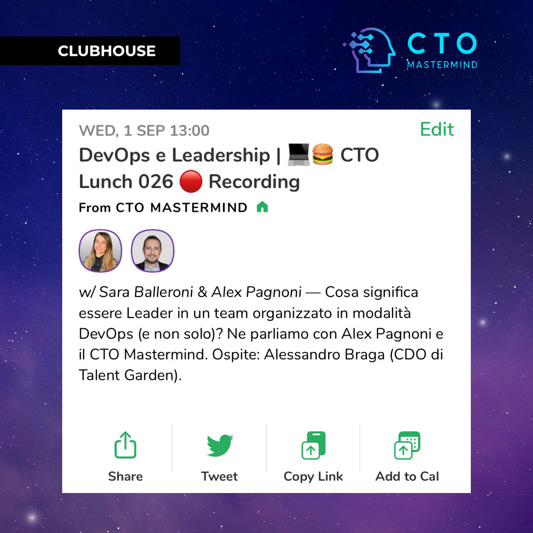 Unisciti a Alex Pagnoni e ai membri del CTO Mastermind su Clubhouse per un pranzo tecnologico in cui confrontare esperienze e opinioni, migliorando continuamente le tue competenze.